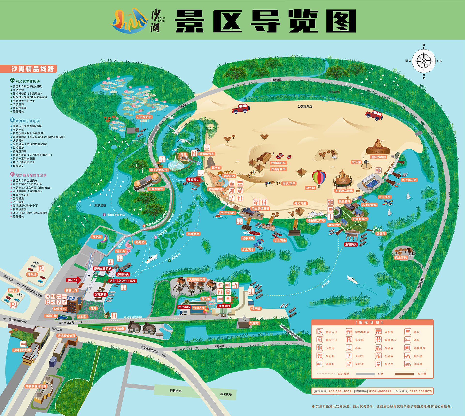 寧夏沙湖生態(tài)旅游區(qū)是一處融合江南水鄉(xiāng)之靈秀與塞北大漠之雄渾為一體的“絲路驛站”上的旅游明珠。主要景點(diǎn)有沙湖國(guó)際沙雕園、鳥(niǎo)島(百鳥(niǎo)樂(lè)園)、湖東濕地(鳥(niǎo)類(lèi)觀(guān)測(cè)站)、新門(mén)區(qū)廣場(chǎng)、沙湖題字石等多余處景觀(guān)組成 。