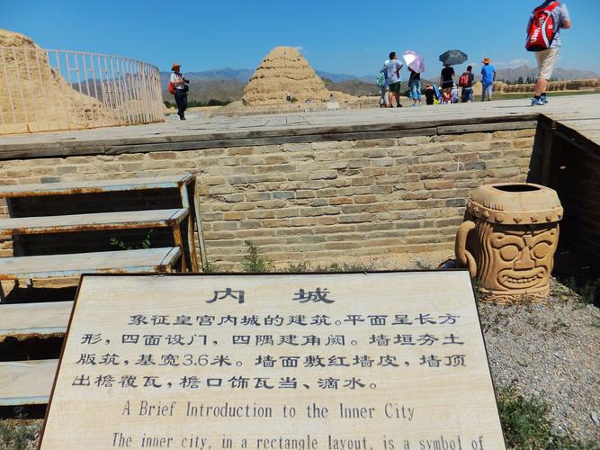 月城北側(cè)為內(nèi)城遺址,四面用神墻環(huán)繞,呈南北長(zhǎng)方形,南北長(zhǎng)180米,東西寬160米。占地約40畝。神墻中部較窄,靠近轉(zhuǎn)角漸寬大,純凈黃土分段夯筑而成,中部每段約3米,殘高約3米,比較平齊,各段如須彌座形狀。神墻四處轉(zhuǎn)角皆很高大,類(lèi)圓柱形,從各轉(zhuǎn)角往神墻兩側(cè),連體圓柱愈來(lái)愈矮小,各有5個(gè),共40個(gè)。其殘存最高達(dá)6米以上,最低的3米,發(fā)現(xiàn)在轉(zhuǎn)角處5個(gè)連體圓柱夯土臺(tái)周?chē)杂写u瓦殘存。內(nèi)城四面神墻皆正中辟門(mén),門(mén)址寬約12米,地面散布瓦片、脊飾殘塊等。根據(jù)統(tǒng)計(jì),內(nèi)城坍塌墻體在2002年時(shí)已達(dá)189.1米,約占?jí)w總長(zhǎng)度的27.8%。南神門(mén)內(nèi)約25米偏西處有一處獻(xiàn)殿遺址。根據(jù)考古發(fā)掘情況看,可能原為一正方形臺(tái)基,臺(tái)面周長(zhǎng)65米,直徑約20米,堆積厚約1米。臺(tái)基以純凈黃土墊起,其上及周?chē)鷼埓娲罅壳啻u灰瓦及琉璃構(gòu)件。獻(xiàn)殿之后約6米為墓道封土,南北長(zhǎng)約42米,呈東南——西北走向,形似魚(yú)脊,以砂石填充。其末端為盜坑,盜坑直徑約20米,深約5米?觾(nèi)長(zhǎng)有若干小樹(shù),兩側(cè)有土堆。內(nèi)城西北隅有一處陵臺(tái),八角形,高約20米,分7級(jí),每級(jí)向內(nèi)收分。陵臺(tái)收分處及周?chē)孛嫔⒉即罅客咂⑼弋?dāng)、滴水等建筑材料。夯土臺(tái)整體形狀為塔形,其上露出一個(gè)個(gè)椽洞,有水平方向的,還有豎斜方向的,證明原來(lái)有椽出頭。距離陵臺(tái)較遠(yuǎn)的四角各有一座角臺(tái),其中東南、西南的兩座角臺(tái)已坍塌,西南角尚可分辨認(rèn)出臺(tái)基,相距約520米。其連線在雙闕臺(tái)之前,北面的2座角臺(tái)相距290米。東北角臺(tái)殘高1米多,坍塌嚴(yán)重,只有西北處的角臺(tái)保存比較完好,殘高約5米,但嚴(yán)重風(fēng)化。北邊兩角臺(tái)相距272米。南北聯(lián)線約460米。夯土臺(tái)因剝蝕已趨圓柱形,底面周長(zhǎng)20米。純凈黃土夯筑,周?chē)⒙渲罅考t褐色板瓦、筒瓦殘片。
