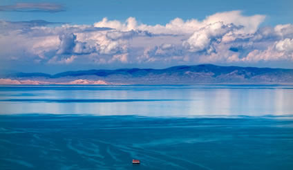 青海省青海湖景區(qū),位于青藏高原的東北部、西寧市西北部、剛察縣南部,距西寧市136公里。青海湖古稱“西海”,又稱“仙海”、“鮮水海”、“卑禾羌海”,是中國最大的內(nèi)陸湖、最大的咸水湖。湖面海拔3196米,湖岸線長360公里,面積4583平方公里,湖水冰冷且鹽份很高。湖中有海心山,四周高山環(huán)繞:北面是大通山,東面為日月山,南面是青海南山,西面為橡皮山。湖區(qū)盛夏時節(jié)平均氣溫僅15℃,為天然避暑勝地。