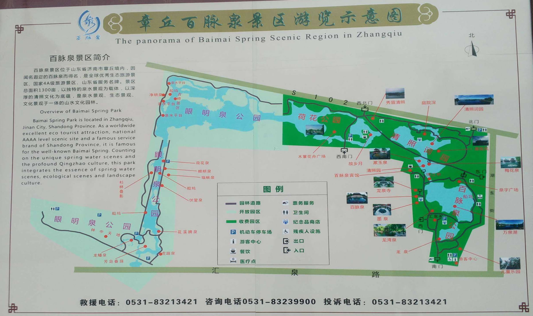公園布局由著名園林專家孫筱祥先生設(shè)計(jì),園名由已故著名書法大師舒同題寫。園內(nèi)噴泉5處,石拱橋3座,石土假山2座,石、木板平橋、各一架。并建有匯泉閣、湖心亭、船塢碼頭等。公園景點(diǎn)布局因地緣勢(shì),順?biāo)飨,逐次展開,設(shè)計(jì)獨(dú)特,構(gòu)思巧妙。全園分為泉水、花園、幽靜學(xué)習(xí)、林蔭散步、兒童樂(lè)園5個(gè)區(qū)。泉水區(qū):奇花異草,千姿百態(tài)、鳥語(yǔ)花香,競(jìng)相斗艷。幽靜學(xué)習(xí)區(qū):環(huán)境幽雅,空氣清新,掩卷吟歌,浮想聯(lián)翩。密林散步區(qū):小橋流水,蜿蜒曲折,灌木叢生,暗柳成蔭。兒童樂(lè)園區(qū):游龍戲水,木馬滑梯,蕩秋千,跳蹦蹦床,高架橋,星空穿梭游藝機(jī),樂(lè)不思?xì)w。公園內(nèi)樓、臺(tái)、亭、榭、閣,點(diǎn)綴其間,錯(cuò)落有致,相互輝映。假山、密林、湖水、斷橋,別有洞天,可謂“疑是山窮水無(wú)路,柳暗花明又一景”。濟(jì)南七十二名泉中的百脈泉乃園中勝景,公園也因之得名。1997年5月,又在園西北隅建成清照罷工(李清照紀(jì)念館),公園風(fēng)光無(wú)限,更添春色。百脈泉公園是鑲嵌在章丘大地上的一顆明珠。百脈泉公園,位于山東省濟(jì)南市章丘區(qū)明水境內(nèi),這里是龍山文化的發(fā)祥地,一代詞宗李清照的故里。