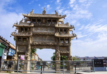 是典型清代石雕建筑,俗稱張家牌坊,被譽為“天下第一坊”,位于牌坊街中段。因其夾柱精雕一百個姿態(tài)各異的石獅子而得名,寓有“百事(獅)如意,百世(獅)多壽(獸)”之意。乃清乾隆四十三年(1778年)為贈文林郎張蒲妻朱氏而建,全石結(jié)構(gòu),高14米,寬9米,四柱三間五樓式,正間單檐,次間正檐,歇山頂,全部石砌。坊座八根夾柱透雕群獅八組,大獅子獰猛崢嶸,小獅子環(huán)繞戲耍。每根夾柱前、左、右三面均浮雕松獅圖。四柱和枋額上透雕云龍,其它部位也透雕加浮雕云龍旋舞,珍禽異獸、花卉圖案。