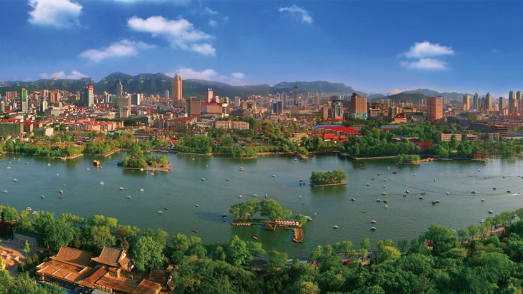 明洪武九年(1376年),濟南成為山東省會。民國十八年(1929年)7月,正式設(shè)立濟南市 。濟南市是國家歷史文化名城,因地處古四瀆之一“濟水”(故道為今黃河所據(jù))之南而得名。遠在9000年前的新石器時代早期,已有先民在此繁衍生息。距今4000至4500年前以磨光黑陶為特征的“龍山文化”,系因民國十七年(1928年)首次發(fā)現(xiàn)于濟南東郊龍山鎮(zhèn)而被命名。濟南是中國人民解放軍北部戰(zhàn)區(qū)陸軍機關(guān)駐地、環(huán)渤海經(jīng)濟區(qū)和京滬經(jīng)濟軸上的重要交匯點,華東地區(qū)重要的交通樞紐之一。濟南因境內(nèi)泉水眾多,擁有“七十二名泉”,素有“天下第一泉”和“四面荷花三面柳,一城山色半城湖”的美譽,濟南八景聞名于世,超然樓是明湖新八景之一,是網(wǎng)紅打卡地,是擁有“山、泉、湖、河、城”獨特風貌的旅游城市。