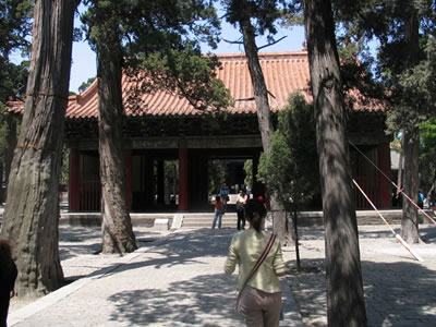 過(guò)大中門,即進(jìn)入孔廟第四進(jìn)庭院。院落疏闊,古樹蔥郁,禽鳥翔集夏天鸛飛鶴舞,白鷺翩翩,冬春鵲鳴雀喧,昏鴉噪晚,顯得十分幽深。