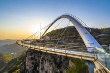 玻璃橋?yàn)闊o(wú)背索斜拉弧形玻璃橋,建于潭溪山海拔700米的崖壁之上,橋面跨度117米,懸空高度101米,外弧最大半徑90米,總承載可達(dá)900噸,單次承載10000人。玻璃橋整體由百米觀(guān)光電梯、懸崖酒店及玻璃橋體組成。其中,百米觀(guān)光電梯采用全景玻璃設(shè)計(jì),依懸崖而建,集觀(guān)光、代步、游覽為一體。橋體的彩虹狀獨(dú)特造型,充滿(mǎn)動(dòng)感與美感,且與山崖風(fēng)格渾然一體。潭溪山高空玻璃橋迄今為止,潭溪山高空玻璃橋已獲得兩項(xiàng)國(guó)際大獎(jiǎng):2019年世界結(jié)構(gòu)大獎(jiǎng)——行人橋梁獎(jiǎng),2020年國(guó)際橋梁大會(huì)(IBC)——亞瑟·海頓獎(jiǎng)。