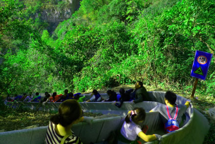 滑道自高門(mén)洞起,至空中玻璃漂流入口處止,長(zhǎng)約千米。此處山坡陡斜,樹(shù)木茂密,滑道從樹(shù)叢中順山勢(shì)蜿蜒而下,看似蟒行山間草叢中。其中有八個(gè)急彎,落差較大,乘坐滑道飛速?gòu)纳巾敾辽窖,驚險(xiǎn)刺激,樂(lè)趣無(wú)窮。