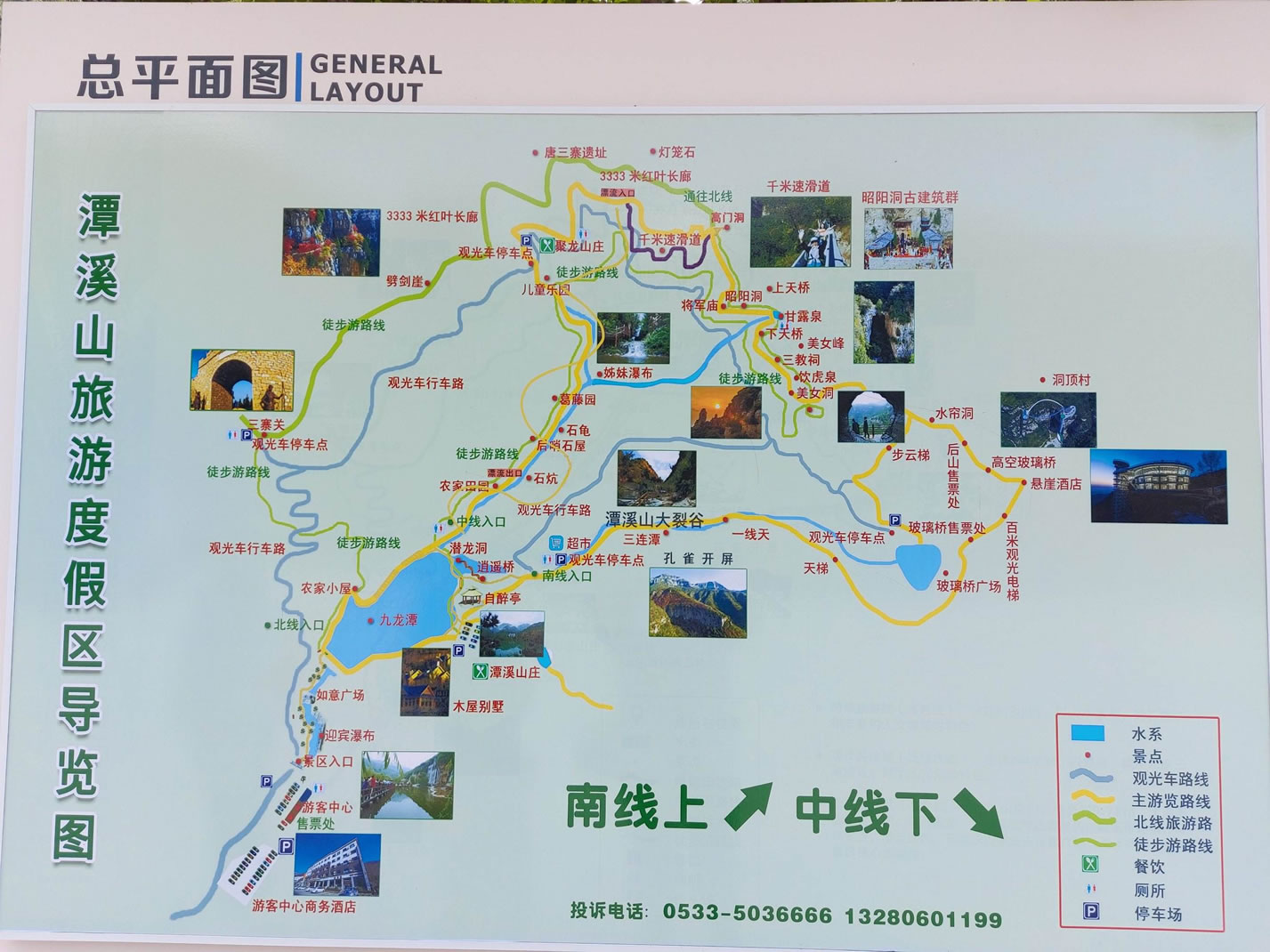 旅游南線(xiàn):全程約3小時(shí),以山水景觀(guān)、奇石怪峽和豐富的人文景觀(guān)為特色,主要景點(diǎn)有: 潭溪山大瀑布、如意廣場(chǎng)、九龍?zhí)、自醉亭、潛龍洞、逍遙橋、石臼、石壩、滄桑石屋、孔雀開(kāi)屏、潭溪山大裂谷、三連潭、太子石像、一線(xiàn)天、較量、兄弟瀑布、石祖(生命之根)、步云梯、王小洞、百米觀(guān)光電梯、高空玻璃橋、洞頂村、星洞傳說(shuō)、水簾洞、龍鳳臺(tái)、美女峰、美女洞、九龍擁翠、飲虎泉、三教祠(昭陽(yáng)南洞)、仙人橋(下天橋)、甘露泉、通天洞(生命之源)、上天橋、昭陽(yáng)洞(昭陽(yáng)洞北洞)、將軍祠、試劍峰、高門(mén)洞、千米速滑道、空中玻璃漂流、兒童樂(lè)園,乘坐觀(guān)光車(chē)或沿旅游中線(xiàn)步行下山。