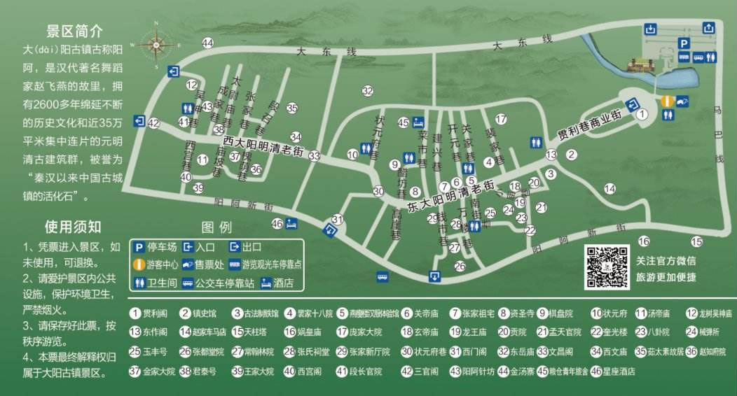 “東西兩大陽,南北四寨上,沿河十八莊,七十二條巷!边@是大陽曾經(jīng)繁華,曾經(jīng)輝煌,曾經(jīng)盛極一時的寫照于記憶是歲月長河大浪淘沙,長期積淀留給世人不可多得的文化珍寶。隨著手工制針業(yè)的衰落,大陽古鎮(zhèn)的商貿(mào)業(yè)也漸漸沒落。古鎮(zhèn)的繁華盛世遠去,卻留下了規(guī)模宏大保存完好的明清古建筑群,大陽鎮(zhèn)因此被稱為“中國古城鎮(zhèn)活化石”。漫步古鎮(zhèn)中,城池寨堡、官宅商居、樓閣津梁、寺廟祠庵比比皆是,一磚一石、一草一木都散發(fā)出滄桑韻味,吸引著八方來客。