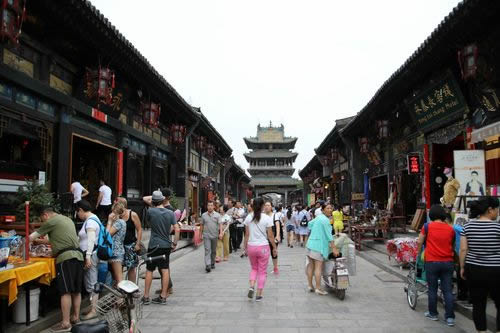平遙古城以南大街為主軸線,以街心的市樓為至高點,城隍、衙署擇高處而立,一東一西,對稱分布,表達了封建統(tǒng)治者“人神共治”的愿望。大型的宗教建筑設(shè)置在城市交通干道的兩端。全城四大街、八小街、七十二條小巷道,經(jīng)緯交織,主次分明 。市井商鋪林立,店面相連。古民居鱗次櫛比,院落重重,宅院(包括商鋪)建筑中軸強烈,對稱嚴(yán)謹,從房舍的配置上體現(xiàn)出長幼有序、尊卑有別的封建倫理觀念。