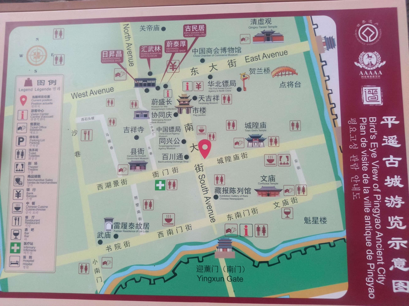 平遙古城素有“中國古建筑的薈萃和寶庫”之稱,文物古跡保存之多、品位之高實為國內(nèi)所罕見。其中有始建于西周,擴建于明洪武3年(1370年),規(guī)模宏大,氣勢雄偉的國內(nèi)保存最完整的古城墻;有始建于北漢天會七年(963年)被列入我國第三位的現(xiàn)存最珍貴的木結(jié)構(gòu)建筑鎮(zhèn)國寺萬佛殿。殿內(nèi)的五代彩塑堪稱珍品,是研究中國早期彩塑的樣本;有始建于北齊武平二年(571年)、被譽為“中國古代彩塑藝術(shù)寶庫”,現(xiàn)存宋元明清彩塑2052尊的雙林寺;有中國宋金時期文廟的罕見實物——文廟大成殿;有中國金融上的開山鼻祖,被譽為“天下第一號”、“匯通天下”的“日升昌”票號;有始建于唐顯慶二年,國內(nèi)古建筑中罕見的“懸梁吊柱”奇特結(jié)構(gòu)清虛觀。觀內(nèi)20余尊木雕神像是研究中國古代木雕造像藝術(shù)和道教發(fā)展的稀有之物;有遍布古城內(nèi)外1000通碑刻及年代不一、形式多樣、色彩續(xù)紛的各種琉璃實物。同時,平遙古城是中國古代民居建筑的薈萃中心之一。古城內(nèi)現(xiàn)存4000處古、近代民居建筑中,有400余處典型地體現(xiàn)著中國古、近代北方民居建筑的風(fēng)格和特點。