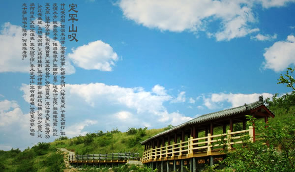 定軍山:定軍山位于陜西省漢中市勉縣城南5千米,三國時(shí)期古戰(zhàn)場。為省級風(fēng)景名勝區(qū)。原屬武侯墓鄉(xiāng),今屬定軍山鎮(zhèn)轄區(qū)。三國時(shí),蜀將黃忠斬夏侯淵、趙顒于此,在歷史上遂負(fù)盛名。屬大巴山脈,其脈自高廟子入平地,隆起秀峰12座,自石山子至元山子,號稱“十二連峰”,再東為當(dāng)口寺孤峰,自西向東綿延十多公里,如游龍戲珠,故有“十二連山一顆珠”之譽(yù)。主峰定軍山為最高處,海拔833米,山頂原有“古定軍山”石碑,文革被毀,今新立。山南有一個(gè)天然鍋底形的大洼,周長1.5千米,即三國時(shí)稱為“可屯萬兵”的“仰天洼”。北麓有一片廣漠沃野,就是當(dāng)年諸葛亮大布“八陣圖”、設(shè)“督軍壇”的武侯坪,黃忠大戰(zhàn)夏侯淵的戰(zhàn)場,時(shí)常發(fā)現(xiàn)“扎馬釘”和箭鏃,傳為蜀軍用兵之物;山旁有“斬將橋”,“八角琉璃井”井口八角形,薄頁細(xì)花紋漢磚砌成,皆不存。山半腰有一大石,高約3.3米,寬約2米,中開一縫,寬窄不一,名曰“擋箭牌”,傳為諸葛亮遮擋敵箭的遺物。
