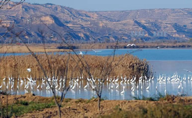 洽川地處我國候鳥南北遷徙的中軸線上,大片的黃河灘涂是鳥類的樂園。這里水源充足,魚蝦豐富,蘆葦茂密,氣候濕潤,每年10月至來年4月,都會有丹頂鶴、白天鵝、大鴇、灰鶴等70余種國家保護的一二級鳥類來此越冬,而黑鸛、蒼鷺、鴛鴦以及赤麻鴨等40余種留鳥則常年在這里繁衍生息,為洽川增添了無限生機。