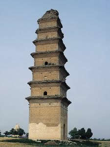 羅山寺塔位于和家莊鄉(xiāng)東馬村村南乳羅山東峰上,也是唐代所建。塔東西兩側(cè)各有清代進士仵魁所筑土塔一座,遠望狀如筆架,故又名“文峰”。塔南山坡下是孟莊鄉(xiāng)岱堡村,因之群眾俗稱“岱堡塔”。羅山寺已不存,今僅留塔。塔為樓閣式空心方形,原為九級,頂已毀,現(xiàn)存八級,殘高約30米。面闊與進深均為三間,券門南向。塔內(nèi)原架木質(zhì)樓板,沿梯可登塔頂,今已不存。塔體呈紡錘形,無基座,各級券洞有假門。高大莊嚴,為合陽諸塔之冠,亦屬陜西省重點文物保護單位。明末清初關(guān)中八高士之一的李灌(向若)先生曾在塔下筑穴而居,稱“小桃源”;清代合陽女詩人雷敬(史夫人)尋夫到此,曾用銀簪在羅山寺門前的照壁刻下“寺野鐘聲遠,山荒風(fēng)雨多”的詩名。大像寺位于平政鄉(xiāng)安陽村東北。大像寺又名“大云禪院”,毀于抗日戰(zhàn)爭時期,獨留此塔。塔系宋代所建,為疊澀密檐式方磚塔,第一屋有券洞,內(nèi)為神龕,十三層,高約30米,下有長寬各4.8米的方形基座。第一層塔檐下普柏枋上設(shè)有斗拱,仿木結(jié)構(gòu),懸空出挑,有實用價值,為本縣諸塔中所僅見。塔項已偏離中心5度,是名副其實的“斜塔”。大像寺又是一座奇妙的回音塔,站在塔北的土胡洞中用瓦片敲擊,便可聽到清脆的蛤蟆叫聲,其余三面均無此現(xiàn)象。
