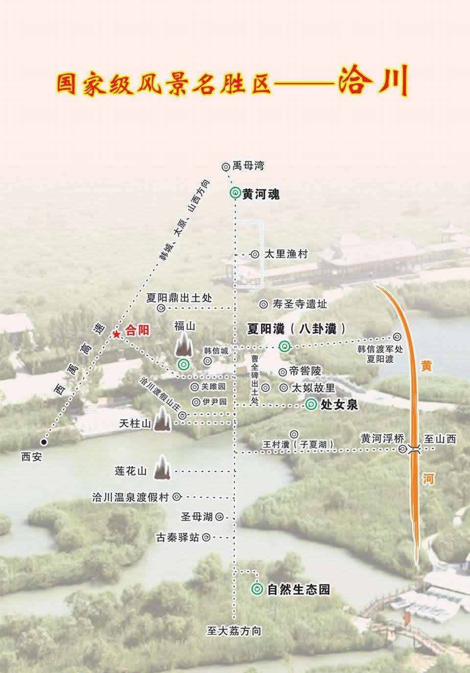 1995年經(jīng)陜西省政府批準設(shè)立的洽川風(fēng)景名勝區(qū),2004年被列為國家級風(fēng)景名勝區(qū),堪稱中華一絕。景區(qū)位于縣城以東20公里的黃河西岸,面積176平方公里。景區(qū)內(nèi)有黃河流域最大的蘆葦蕩(10萬畝)和最大的濕地保護區(qū)(15萬畝),白天鵝、丹頂鶴、黑鸛、大鴇等百余種國家一、二級保護動物在此棲息。景區(qū)的7處瀵泉天下獨有,其中"處女泉"最為神奇,人入水不沉,泉涌沙動,如綢佛身,如沙浪浴,是名符其實的"華夏一絕"。"萬畝蘆蕩,千眼神泉,百種珍禽,十里荷塘,一條黃河,秦晉相望",是洽川風(fēng)景名勝區(qū)的真實寫照。觀洽川景,游處女泉,住農(nóng)家院,享農(nóng)家樂,擁抱母親河已成國內(nèi)外游客的神往。