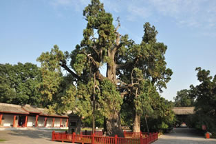 黃帝腳印石旁,有一棵漢武掛甲柏,又稱將軍柏,志載:“漢武帝征朔方還,掛甲于此樹。”樹干斑痕密布,縱橫成行,似有斷釘在內(nèi),是群柏之中最為奇特的一株。特別是每年清明節(jié)前,這棵古柏枝干上流出的柏液凝結(jié)為球狀,經(jīng)陽光反射尤為壯觀,吸引著各地前來謁陵拜祖的人。然而清明節(jié)一過,柏液中斷,古柏從枝到桿又恢復(fù)了原來密密麻麻的甲痕。