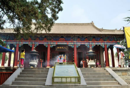 沿中軸線北行即到誠心亭,原稱過亭,面闊五間,進(jìn)深一間,面積約85平方米。歇山頂上,灰布板瓦與筒瓦緊緊相扣,前檐施勾頭滴水,四邊無墻,欄額下為花格裝飾,旋子彩繪。明間南北兩側(cè)臺基石砌如意踏步,次間、補(bǔ)間外側(cè)有圍欄圍護(hù)。亭柱上書有兩幅楹聯(lián):“觀天地生物氣象,讀古今經(jīng)世文章”;“誠朝圣地人文祖,心祭神州兒女情”。