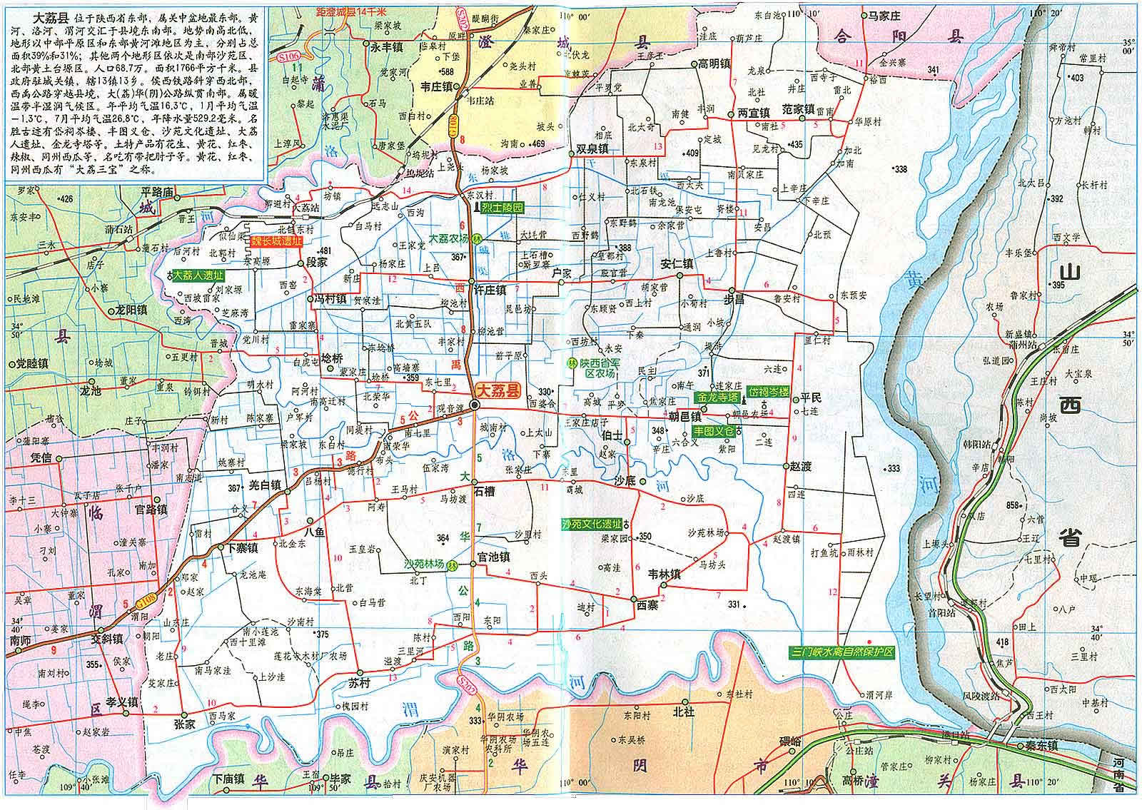 大荔縣位于關(guān)中平原東部,是黃 、洛、渭三河匯流之地。南界渭河與潼關(guān)、華陰、華縣為鄰,西繞洛河與蒲城、臨渭區(qū)毗連,北沿臺(tái)塬與澄城、合陽縣接壤,東瀕黃河與山西永濟(jì)相望,素有"三秦通衢"、"三輔重鎮(zhèn)"之稱。大荔縣總面積為1776.1平方公里,全縣轄7鎮(zhèn)26鄉(xiāng),414個(gè)行政村。總?cè)丝?2萬人。
