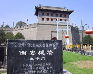 永寧門俗稱南門,是西安城門中資格最老、沿用時間最長的一座,建于隋初。是皇城南面三座門中偏東的一座,稱安上門,唐末韓建縮建新城時留作南門,明代改名永寧門。永寧門箭樓在西安保衛(wèi)戰(zhàn)(也稱二虎守長安)中被毀,于2013年在原址上重建。永寧門規(guī)格為6+1式門洞。