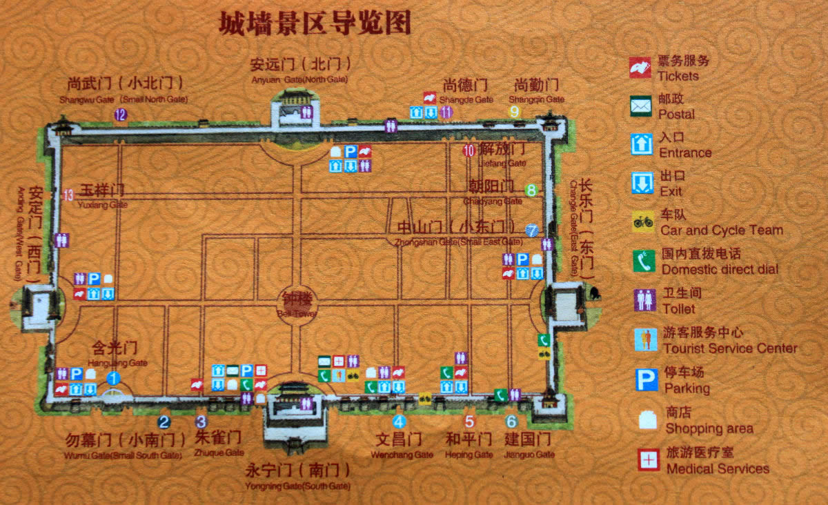 西安城墻現(xiàn)有城門18座,從永寧門開始順時針依次為:永寧門、朱雀門、勿幕門、含光門、安定門、玉祥門、尚武門、安遠(yuǎn)門、尚德門、解放門、尚儉門、尚勤門、朝陽門、中山門、長樂門、建國門、和平門、文昌門。這18座城門的形成時間和規(guī)格各不相同。