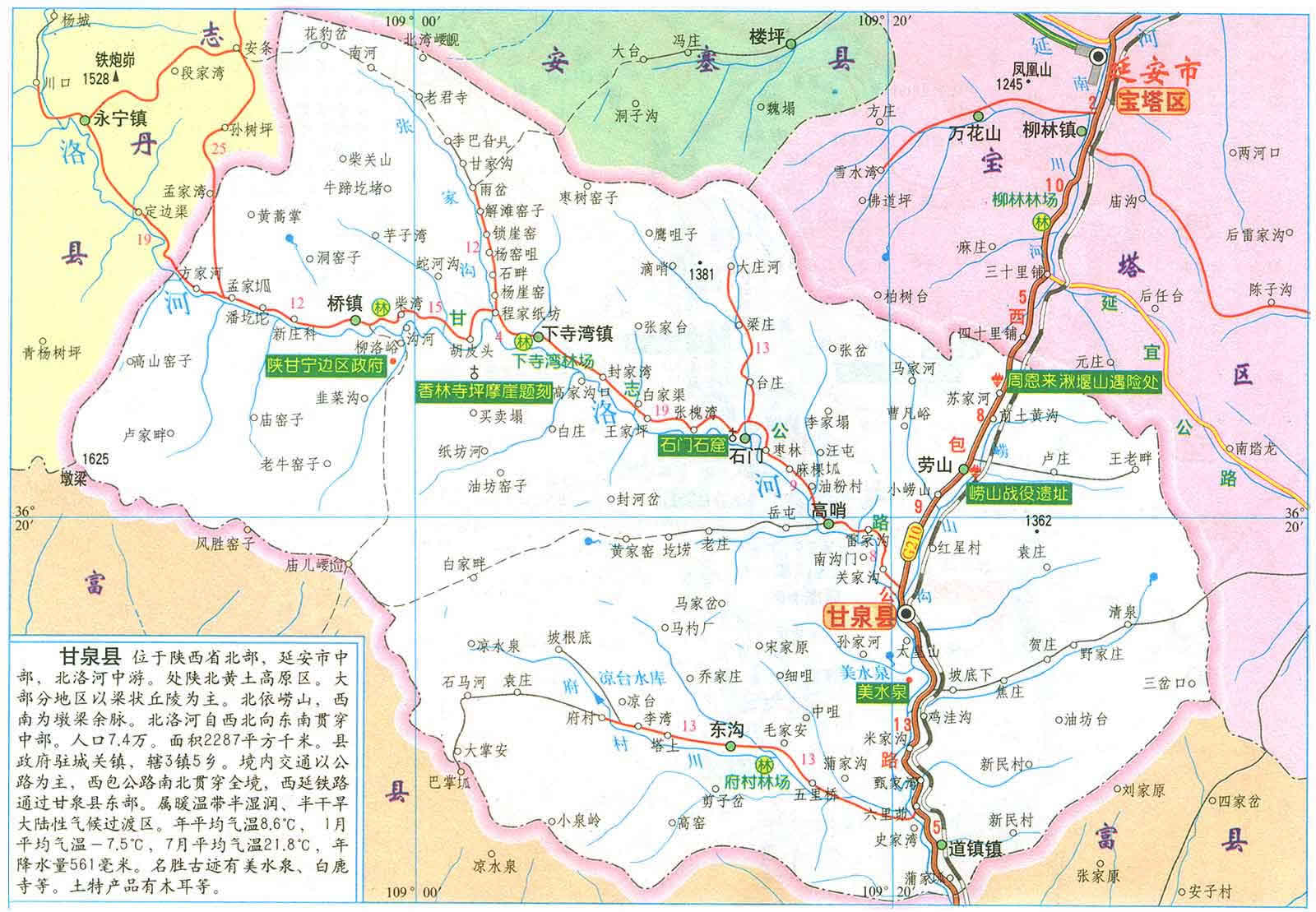 甘泉縣地處陜西省延安市中部,總?cè)丝?3507人,其中農(nóng)業(yè)人口53600人,總面積2284.7平方公里。210國(guó)道、西延鐵路和即將開(kāi)工建設(shè)的黃陵-延安高速公路穿境而過(guò),交通十分便利。