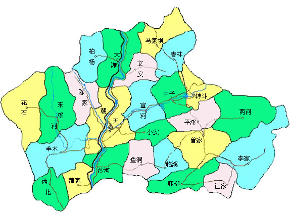 朝天區(qū)轄6個(gè)鎮(zhèn)、19個(gè)鄉(xiāng):朝天鎮(zhèn)、大灘鎮(zhèn)、羊木鎮(zhèn)、曾家鎮(zhèn)、中子鎮(zhèn)、沙河鎮(zhèn)、陳家鄉(xiāng)、小安鄉(xiāng)、魚(yú)洞鄉(xiāng)、東溪河鄉(xiāng)、花石鄉(xiāng)、蒲家鄉(xiāng)、西北鄉(xiāng)、宣河鄉(xiāng)、轉(zhuǎn)斗鄉(xiāng)、青林鄉(xiāng)、平溪鄉(xiāng)、兩河口鄉(xiāng)、李家鄉(xiāng)、汪家鄉(xiāng)、麻柳鄉(xiāng)、臨溪鄉(xiāng)、文安鄉(xiāng)、馬家壩鄉(xiāng)、柏楊鄉(xiāng)。