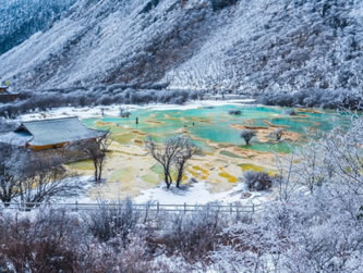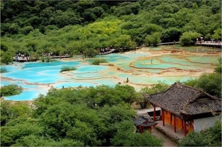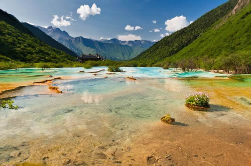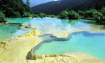 進(jìn)入黃龍景區(qū),首先看到的是一組精巧別致、水質(zhì)明麗的池群--迎賓池。池子大小不一,形狀奇特,色彩艷麗,錯落有致,四周山岳環(huán)峙,林木蔥蘢,山間野花競放,彩蝶飛舞。山間石徑曲折盤旋,點(diǎn)綴著觀景亭閣,倍添情趣。