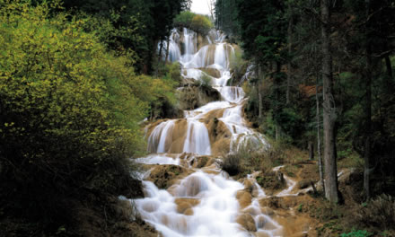 在牟尼溝風(fēng)景區(qū)原始大森林中,有一睽巨大的水流自104米高的臺階式鈣華化巖體上,洶涌咆哮著似自九天直傾而下,氣勢極為壯觀,它是我國最大的鈣化瀑布——扎嘎大瀑布。 扎嘎瀑布地處海拔3270米,瀑高93.2米,寬35米。上游是湖泊,下游為一串階梯式河床。上百個層層疊疊的鈣化環(huán)型瀑布玉串珠連,經(jīng)三級鈣化臺階跌宕而下,沖擊成巨大鈣化面而形成朵朵巨大白花,瀑聲如雷,聲形兼?zhèn)。在大瀑布第二階的鈣化壁上,有一“水簾洞”,洞口水流飛掛,洞內(nèi)氣象萬端。