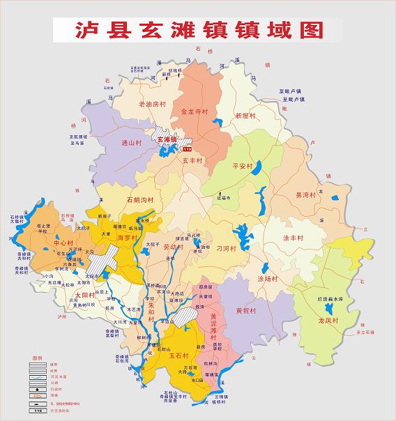 瀘縣玄灘鎮(zhèn)鎮(zhèn)域圖 行政區(qū)劃 瀘縣玄灘鎮(zhèn)幅員面積115平方公里,轄區(qū)內(nèi)人口9萬人,城鎮(zhèn)建成區(qū)面積2平方公里,常住人口2.2萬人。轄5個社區(qū)、20個行政村《正大街社區(qū)、東街社區(qū)、西街社區(qū)、中和社區(qū)、喻坪社區(qū) 》、《石鵝溝村、金龍寺村老油房村、通山村、石鵝溝村、玄豐村、新屋村、平安村、刁河村、黃坭村、涂場村、龍鳳村、涂豐村、易灣村 、太陽村、中心村、海羅村、玉石村、黃泥灘村、勞動村、朱和村》。 歷史沿革 1934年設(shè)玄灘鎮(zhèn),1937年改鄉(xiāng),1951年復(fù)建鎮(zhèn),1958年改公社,1992年再復(fù)鎮(zhèn)。1997年,面積74平方千米,人口5.6萬,轄龍鳳、飛躍、永紅、涂鋒、刁河、馮光、黃泥、同豐、黃林、新山、平安、光前、紅星、向灣、易灣、斷石龍、新屋、蔣灣、金龍寺、新房子、玄鋒、高場、陳家咀、石鵝溝、通山、萬居所、桑壩、東風(fēng)、宋糟坊、瓦子壩、清油坊31個行政村和正大街、馬路街、半邊街、鹽聯(lián)街4個居委會。 2004年,面積78平方千米,轄31個村、4個社區(qū),總?cè)丝?7621人。集鎮(zhèn)建成區(qū)面積1.7平方千米,常住人口2.15萬人。 2006年,將原玉河鎮(zhèn)所屬行政區(qū)域并入玄灘鎮(zhèn)。玄灘鎮(zhèn)政府駐玄灘場。