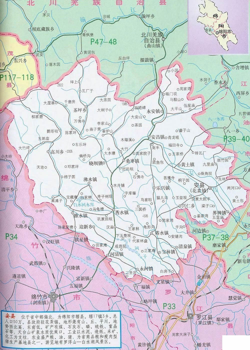 安縣位于四川盆地西北部,距成都110公里,距綿陽科技城10公里。縣境山丘壩兼有,幅員1404平方公里??cè)丝?0萬人,轄4鄉(xiāng)16鎮(zhèn)。安縣氣候宜人,生態(tài)環(huán)境優(yōu)美。屬亞熱帶濕潤季風氣候,氣候溫和,雨量充沛,四季分明,日照充足,無霜期長。年均氣溫16.3℃,年均降水量1260mm,空氣質(zhì)量常年達國家二級標準,森林覆蓋率達42%。縣內(nèi)交通四通八達,人流、物流進出快捷方便 ,現(xiàn)代通訊覆蓋全縣,并開通了ADSL業(yè)務和高速寬帶網(wǎng)絡,光纖有線電視遍布城鄉(xiāng)。自然資源豐富,有水泥石灰石、磷礦、煤、硫鐵礦、重晶石、鋁土礦等礦產(chǎn)資源29種,儲量豐富;有動物資源948種,其中大熊貓、金絲猴等國家一、二級保護動物77種;有植物資源814種,其中銀杏、珙桐等國家一級珍稀植物及棗皮、杜仲、烏藥等中藥材資源100多種。工業(yè)基礎良好。電子、建材輕化、能源、化工、食品等支柱工業(yè)日益壯大。農(nóng)業(yè)生產(chǎn)條件優(yōu)越,農(nóng)村經(jīng)濟持續(xù)發(fā)展。雜交水稻制種、優(yōu)質(zhì)水稻、無公害蔬菜、水果、無規(guī)定疫病畜禽養(yǎng)殖、水產(chǎn)、蠶桑、魔芋、棗皮等農(nóng)業(yè)產(chǎn)業(yè)化經(jīng)營蓬勃發(fā)展。