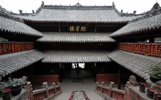 家慶堂屋頂為歇山頂,整個(gè)殿宇雄偉華麗,它的屋頂脊飾很有特色。正脊正中有三重樓閣,樓閣之上有寶頂,樓閣后底部雕塑有彌勒佛;9個(gè)脊梁之上都有蹲獸,在4個(gè)翼角戧脊之上塑有天上四靈,以正四方。什么是“四靈”呢?就是青龍、白虎、朱雀、玄武;為何要塑“四靈”?因?yàn)楣湃顺S小白簖堄一⒈俨幌,朱雀玄武順陰?yáng)”的說(shuō)法。在歇山下邊的正中位置,還有“上有仙人不知老,渴飲玉泉饑食棗”等生動(dòng)有趣的裝飾性塑像。如果站在代表二十四孝的石階下仰望整個(gè)家慶堂時(shí),更會(huì)有華麗多彩、猶如海市蜃樓的感覺(jué)。