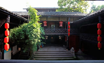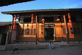 王朝聞故居(添壽堂)位于古鎮(zhèn)進士牌坊下側(cè),立木結(jié)構(gòu),是川南典型四合院,面積500平方米,院內(nèi)天井50平方米,有明代古井一口,一方戲樓,三方廂樓,木雕精美。故居分為戲樓、正堂、客廳、臥室、天井、作坊室、偏房等。正堂供奉神龕、神案,左右置太師椅。作坊室是王朝聞少年時代使用的碾子、龍骨車、風簸、簸箕、撮箕、蓑衣、斗筐、鋤頭、犁耙等。