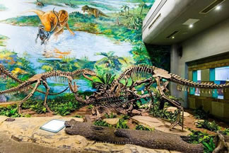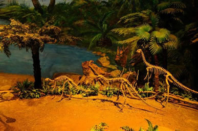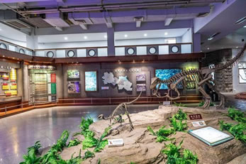 自自貢恐龍博物館的現(xiàn)有基本陳列“侏羅紀(jì)恐龍世界”,按照“恐龍世界——恐龍遺址——恐龍時(shí)代的動(dòng)植物——珍品廳——恐龍?jiān)佻F(xiàn)”順序展開,吸收現(xiàn)代陳列理念,采用場(chǎng)景式展示、擬人化組合,輔之以聲、光、電及多媒體等展示手段,展開了一幅蔚為壯觀、神奇瑰麗史前畫卷,再現(xiàn)了由恐龍及許多早已消失的物種構(gòu)成的神秘多姿的侏羅紀(jì)時(shí)代。同時(shí),還突出展示了博物館的精華—化石埋藏現(xiàn)場(chǎng),給人以強(qiáng)烈的視覺(jué)沖擊和心靈震撼,充分體現(xiàn)了專業(yè)博物館與遺址博物館的雙重特色。