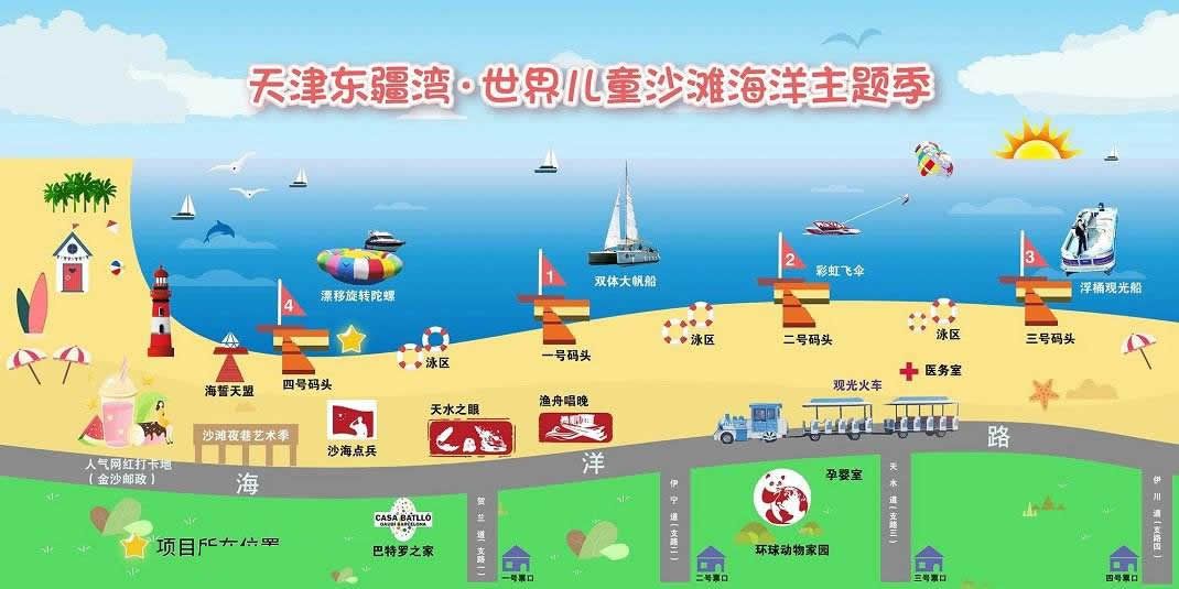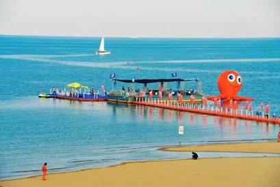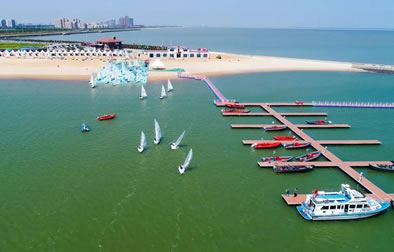 景區(qū)還將增添激情水上飛碟、快艇漂移、水上沙發(fā)、水上UU船、帆船、海上滑梯、海上蹺蹺板等數(shù)十項大型游樂設施,讓這里真正成為海上“迪士尼”。作為配套設施,在人工海灘西側(cè)修建濱海路,全長1.3公里,道路寬24米,為景區(qū)內(nèi)步行觀景道路,道路兩側(cè)綠化面積約6700平方米。綠化廣場總面積12萬平方米,景區(qū)停車場總面積約4700平方米。景區(qū)設置為沙灘親水區(qū)、沙灘游泳休閑區(qū)、水上運動休閑中心和水上休閑娛樂區(qū)。其中,位于沙灘游泳休閑區(qū)已經(jīng)建成的海景會所,是目前國內(nèi)北方最大的單體木結(jié)構(gòu)海景酒店會所,設有餐飲、住宿、淋浴、商務、娛樂等設施,并提供有地道的天津狗不理包子。另外,會所周邊正在建設游艇會所、五星級酒店、運動廣場、低密度住宅、高爾夫球場等設施。配套服務設施將逐步完善。