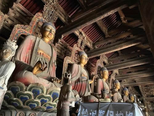 山門前兩稍間是兩尊遼代彩色泥塑金剛力士像,俗稱“哼”“哈”二將,后兩稍間是清代繪制的“四大天王”彩色壁畫。山門梁柱粗壯,斗拱雄碩,“升起”和“側(cè)腳”明顯。據(jù)說山門的牌匾乃嚴(yán)嵩所題。