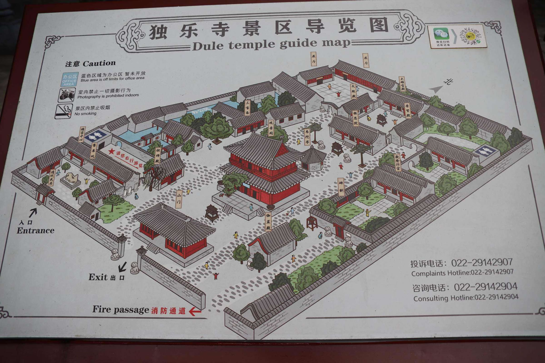 獨(dú)樂寺山門是我國現(xiàn)存最早的廡殿頂山門,山門面闊三間,進(jìn)深兩間,中間做穿堂,正脊兩端的鴟吻,造型生動(dòng)古樸為,遼代原物。