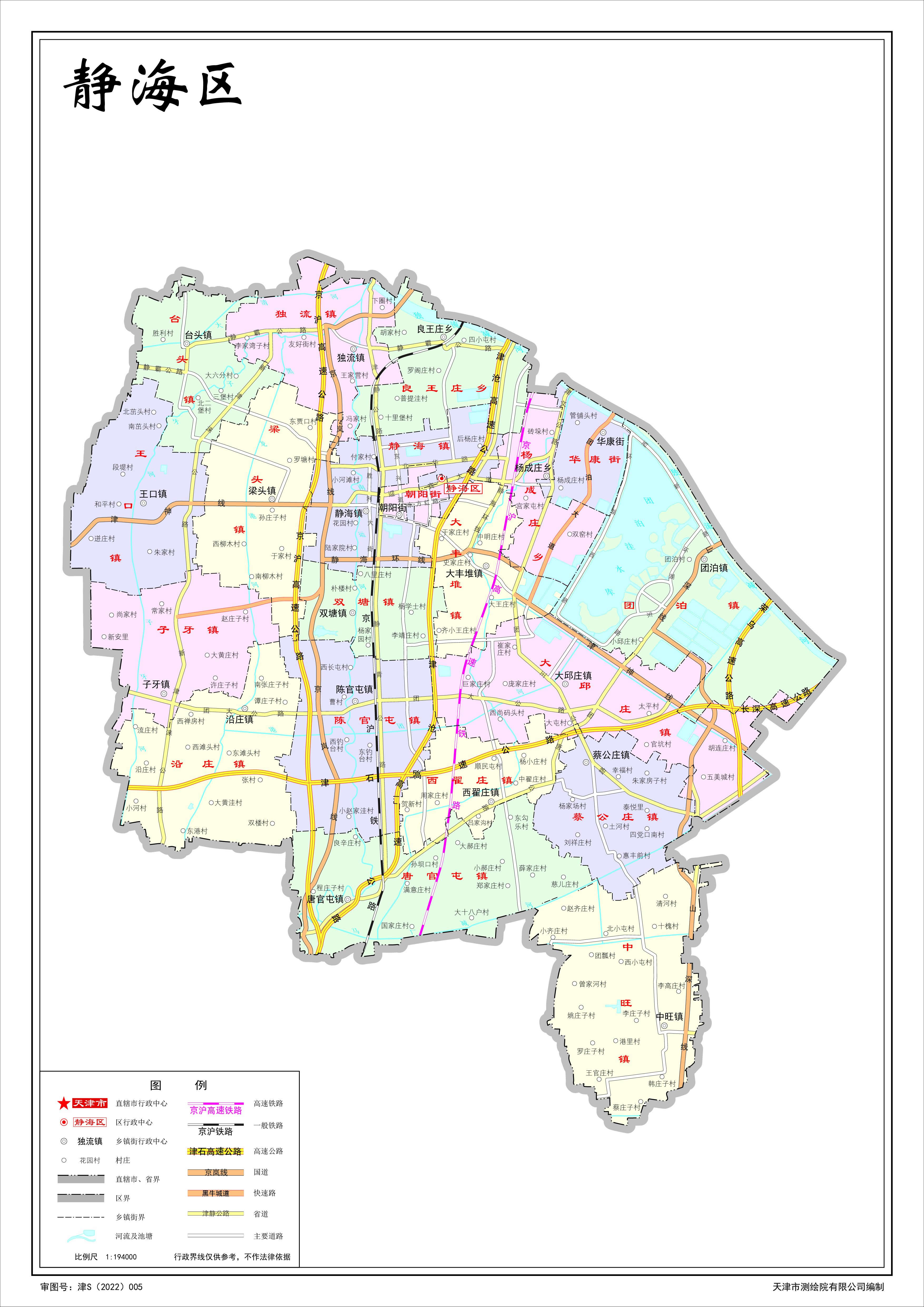 靜海區(qū),隸屬天津市,位于天津西南部。東與濱海新區(qū)為鄰,東北隔獨流減河與西青區(qū)相望,西北與霸州市相連,西與文安縣接壤,西南與大城縣為鄰,東南與黃驊市相依,南與青縣為界,總面積1475.68平方千米。靜海區(qū)常住人口77.64萬人,戶籍人口64.37萬人。靜海區(qū)下轄2個街道、16個鎮(zhèn)、2個鄉(xiāng)。靜海區(qū)人民政府駐靜海鎮(zhèn)迎賓大道99號。
