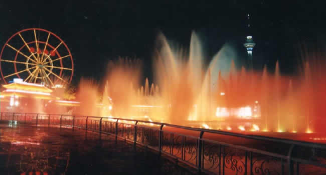 位于水上公園東門入口處,面積約6.5公頃的湖面,將靜態(tài)之水變?yōu)榛虮简v、或疊落、火噴涌的動(dòng)態(tài)之水。從東到西依次排列了: