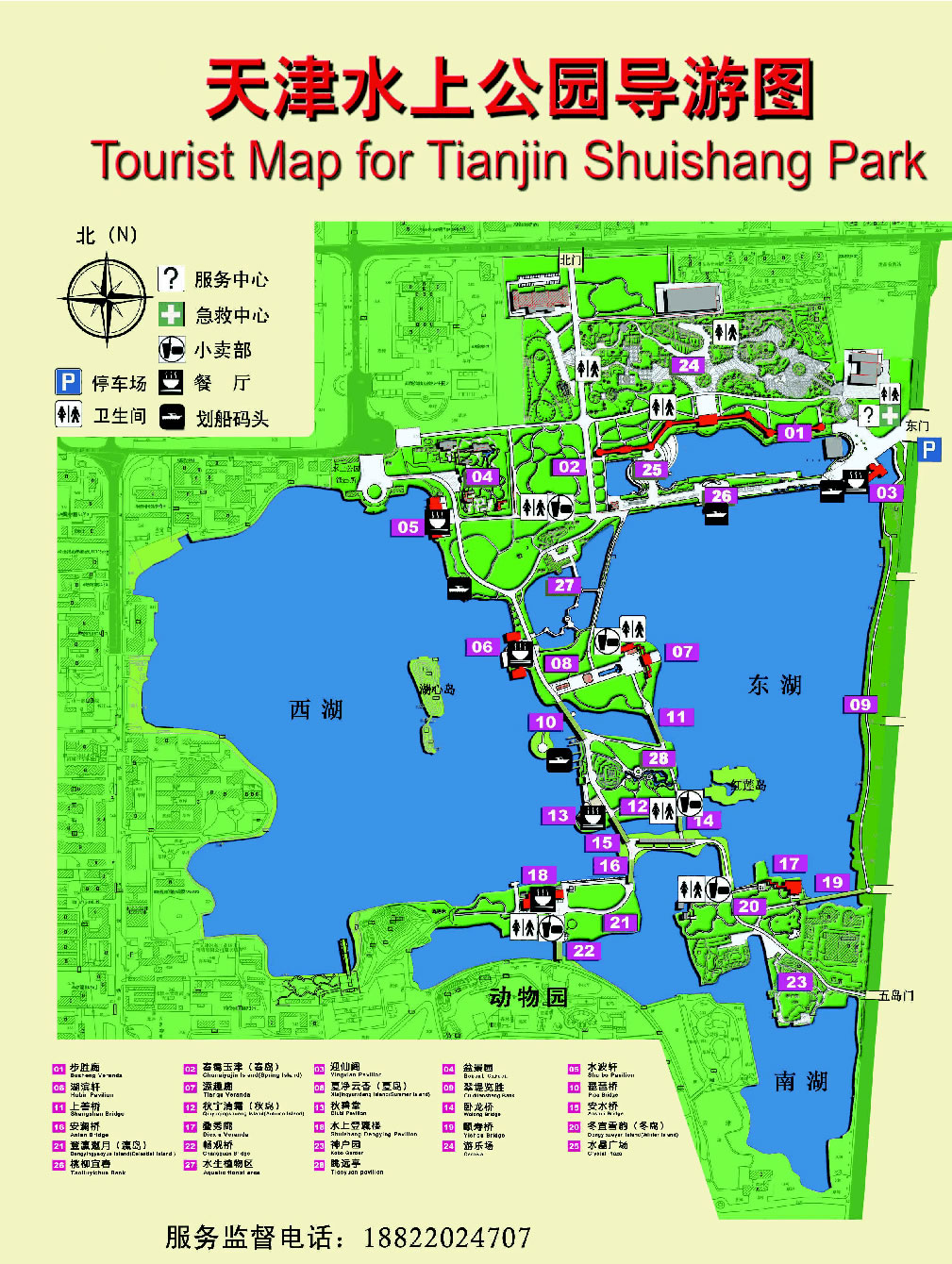園中南、北部分為大塊陸地,中間是廣闊的水面,水中有11個(gè)小島,分別由拱橋、曲橋、平橋和桃柳堤連接,湖水映著朱紅樓閣,湖中碧波蕩漾,游人可劃船漫游湖上。構(gòu)成這座公園獨(dú)具特色的水上世界。位于水上公園南部的動(dòng)物園,面積50.5公頃。園內(nèi)有動(dòng)物獸舍31處,如:大象館、熊貓館、百鳥籠及海獸館、獅虎山等。還有鹿、羊等溫順動(dòng)物的放養(yǎng)區(qū)。全園內(nèi)共有野生動(dòng)物近147種,1400余只。到2005年,計(jì)劃動(dòng)物類種發(fā)展到220個(gè),總數(shù)量接近3000只。