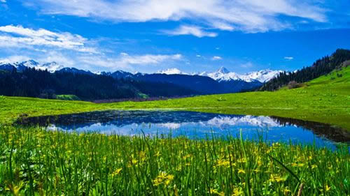 從闊谷東側穿林攀山而上,眼前一望無際,遼闊美麗的草原就是頗具勝名的庫爾德寧大草原。草原上山花爛漫,牛羊蠕動,群馬奔騰,處處都是“風吹草地見牛羊”的動人景象;山灣溪畔,密林排映之下是氈房點點,炊煙裊裊;極目遠眺,天際處,皚皚雪峰在陽光照射下,幻化出五顏六色的光芒;齊齊的林線下是郁郁蔥蔥,綿延不絕的茫茫林海;藍天上,白云朵朵,雄鷹展翅翱翔;在草原西南側,鑲嵌著一面園月以的小湖,水平如鏡,清澈見底,天光云彩,湖中徘徊,詩情畫意油然而生。日暮時分,夕陽如血,霞飛滿天,光移景動,山色朦朧,群山露紅,層林盡染,更是難得的景致。庫爾德寧草原風光無限,美麗如畫,令人目不暇接。 |
