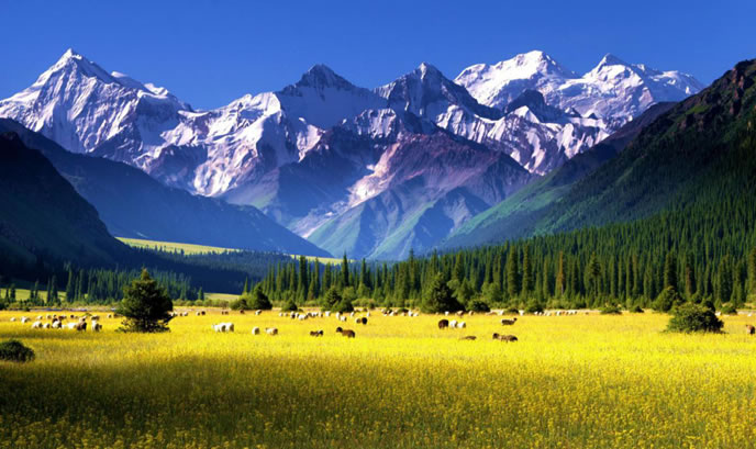 地形地貌 昭蘇縣為中亞內陸腹地一個群山環(huán)抱的高位山間盆地,由于四周高山環(huán)抱,形成了一個較為獨特的自然生態(tài)環(huán)境,海拔在1323米-6995米之間。南部為天山主脈,山勢雄偉,高峻綿亙,是阻擋南疆沙漠干熱風的天然屏障;北部為烏孫山,呈東西走向,山體較矮;西部受沙爾套山以及哈薩克斯坦境內查旦爾山的阻隔,形成一個南、西、北三面高,東部略低的盆地。山地、丘陵與平原之比為4∶1。號稱“天山之父”的汗騰格里峰,位于西南部的中哈邊境線上,海拔6995米,是天山山脈第二大高峰,終年積雪區(qū)達100平方公里以上,是特克斯河的主要水源。是新疆境內唯一一個沒有荒漠的縣。