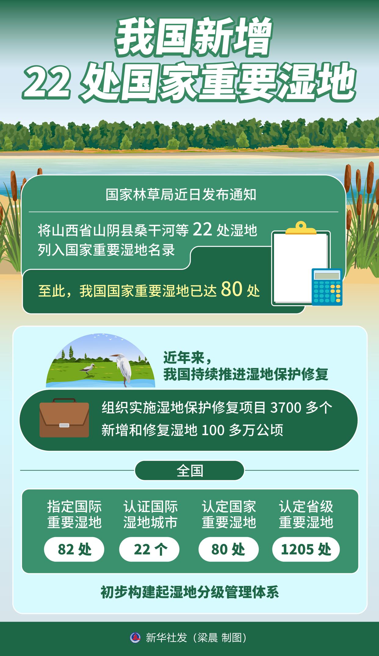 近年來,我國持續(xù)推進濕地保護修復(fù),組織實施濕地保護修復(fù)項目3700多個,新增和修復(fù)濕地100多萬公頃。全國共指定國際重要濕地82處、認證國際濕地城市22個、認定80處國家重要濕地和1205處省級重要濕地,初步構(gòu)建起濕地分級管理體系。