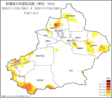2025年11月5日08時(shí)至6日08時(shí)新疆大風(fēng)實(shí)況圖 (央廣網(wǎng)發(fā) 新疆氣象局供圖)