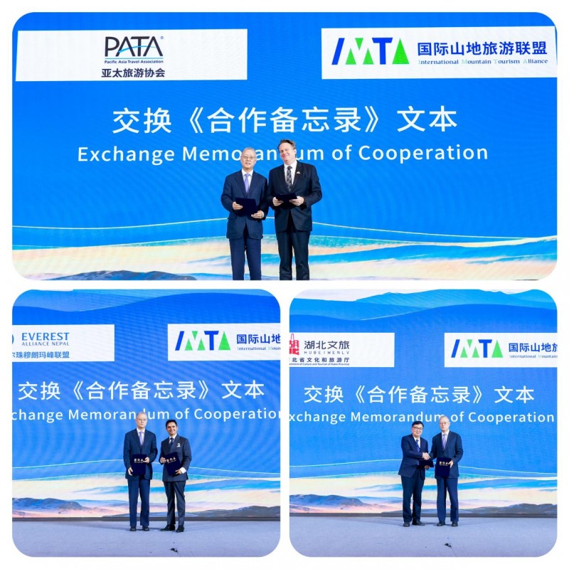 國(guó)際山地旅游聯(lián)盟副主席兼秘書長(zhǎng)何亞非分別與亞太旅游協(xié)會(huì)主席彼得·西蒙(Peter Semone)、尼泊爾珠穆朗瑪峰聯(lián)盟主席蘇大山·尼泊爾(Sudarshan Nepal)、湖北省文化和旅游廳副廳長(zhǎng)徐勇交換合作備忘錄,旨在通過(guò)資源共享、優(yōu)勢(shì)互鑒,為全球旅游業(yè)可持續(xù)增長(zhǎng)注入新動(dòng)能、貢獻(xiàn)實(shí)踐力量。