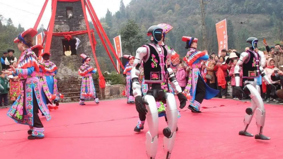 活動期間,南寶山鎮(zhèn)木梯羌寨處處洋溢著歡慶氛圍,文化傳承與民生溫度交織共生。從莊重的寨門迎新、祭祀祈福儀式,到釋比老人手持羊皮鼓吟唱經(jīng)文的千年信仰傳承;從《摘花椒》《永遠(yuǎn)是一家》等傳統(tǒng)羌族歌舞展演,到身著迷你羌服的機(jī)器人跳沙朗舞的“科技+民俗”創(chuàng)意碰撞……每一個環(huán)節(jié)都承載著羌族文化的根脈,也傳遞著南寶山鎮(zhèn)發(fā)展文旅產(chǎn)業(yè)的具體實踐。