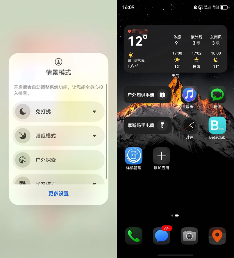 除此之外,我還留意到一個很貼心的設(shè)計:開啟戶外探索模式后,桌面上的天氣時鐘組件會自動切換成“戶外版”——字體變得粗大清晰。在戶外徒步中,只需瞥一眼屏幕,快速知曉時間、氣溫等。