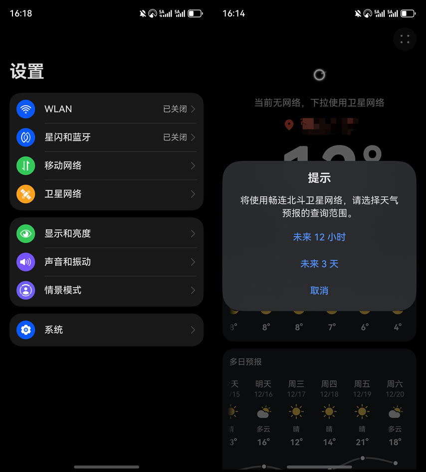 哪怕營地完全沒有信號,現(xiàn)在也不用慌。有網(wǎng)絡(luò)時提前在設(shè)置-衛(wèi)星網(wǎng)絡(luò)里打開“暢連北斗衛(wèi)星消息”后,我可以切換到衛(wèi)星網(wǎng)絡(luò)模式,能查看未來12小時、最長3天的天氣數(shù)據(jù)。手里有這個戶外神器,再也不必?fù)?dān)心與世隔絕和天氣突變了。