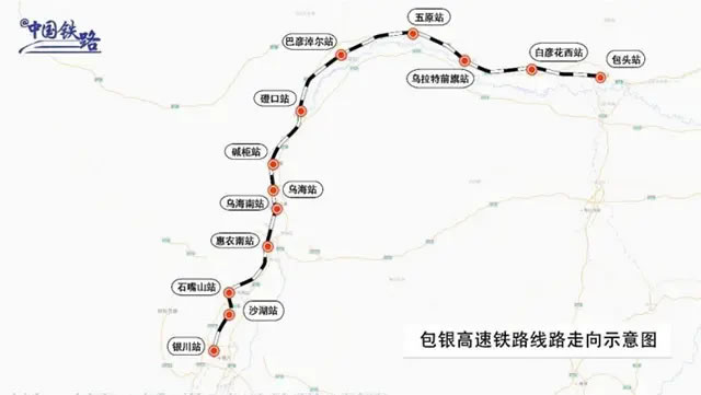 包銀高鐵起自包頭站,經(jīng)內(nèi)蒙古自治區(qū)包頭市、巴彥淖爾市、鄂爾多斯市、烏海市,寧夏回族自治區(qū)石嘴山市、銀川市,接入銀川站,正線全長519公里,設(shè)計時速250公里,實行分段建設(shè)。其中,惠農(nóng)至銀川段全長97公里,已于2024年10月開通運營,此次開通的包頭至惠農(nóng)段全長422公里,共設(shè)包頭、白彥花西、烏拉特前旗、五原、巴彥淖爾、磴口、堿柜、烏海、烏海南、惠農(nóng)南10座車站,其中包頭、巴彥淖爾、烏海、惠農(nóng)南站為既有車站,其余車站為新建車站。