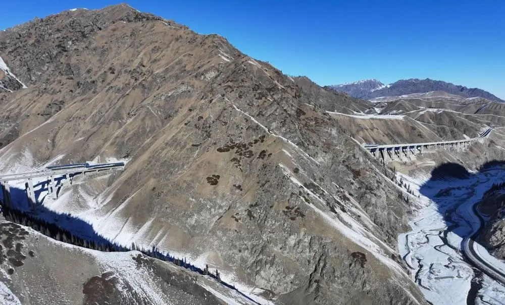 12月下旬,記者驅(qū)車從烏魯木齊前往烏尉高速采訪。寒風掠過天山山脊,皚皚白雪覆蓋著險峻山群,層巒疊嶂之中,一條大道向前鋪展,于天山內(nèi)部打通條條隧道,在崇山峻嶺間架設橋梁。