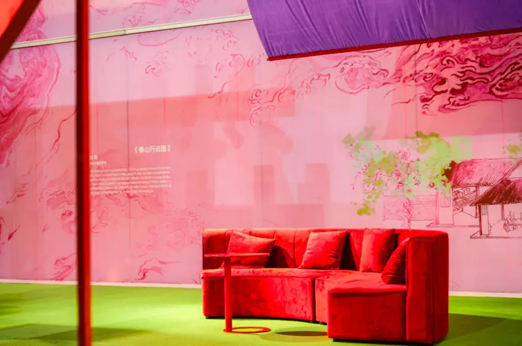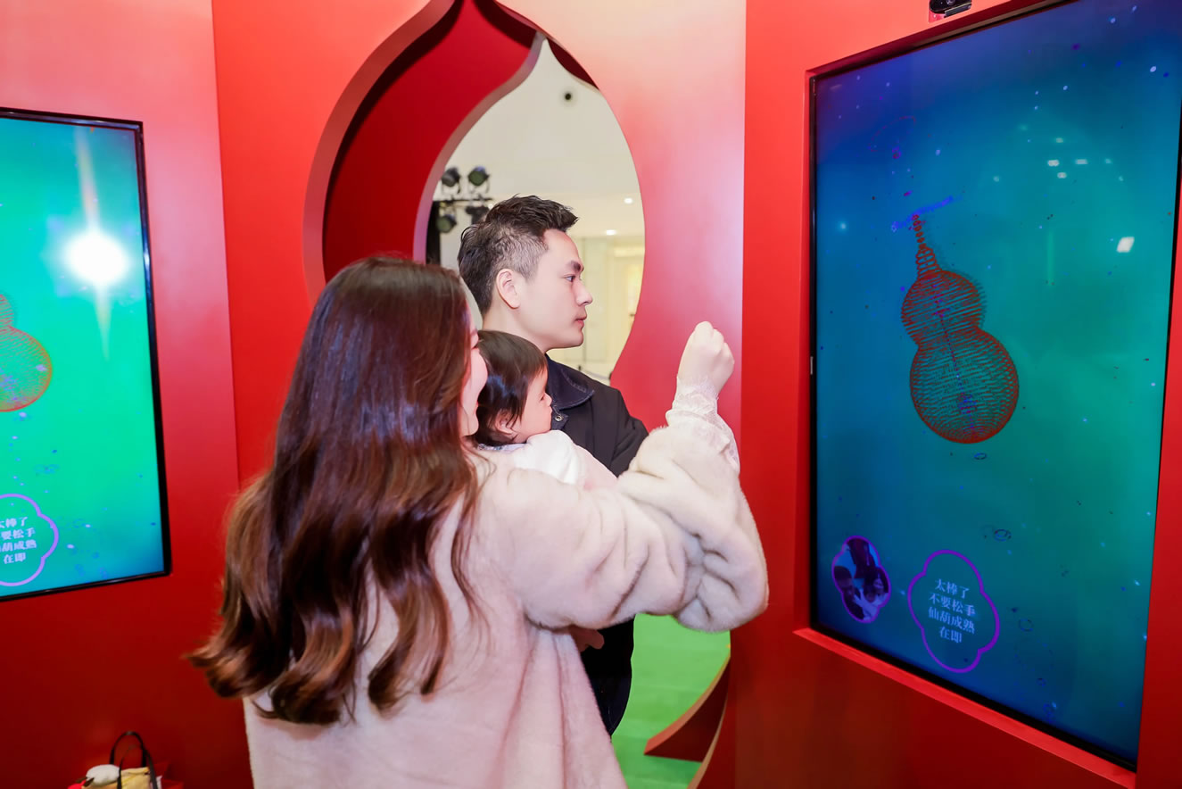 山水,并非遠(yuǎn)行才可得見。書法水墨藝術(shù)家劉玥首展作品《春山行遠(yuǎn)圖》以20米巨幅“山水開卷”,步入其中,與天地春意從容照面;紅色的帷幔落于銀色的松枝上,就像于山間松下靜謐的一隅,“幕下棲心”將是絕佳開年時(shí)尚大片的打卡處;松下銀椅,為你與摯友“漫敘往來”的相聚時(shí)刻營造出寧靜、松弛的氛圍;多寶閣中陳列著未經(jīng)雕琢的茶器素胚與場內(nèi)品牌萬仟堂,長沙尼依格羅酒店及tea'stone帶來的新春茶器,以“初芒蘊(yùn)能”詮釋著未來的無限可能與新生力量。轉(zhuǎn)身與“蒔光種愿” 四方亭相遇。葫蘆門朝四方而開,寓意著納四方福祿,步入其中,與數(shù)字交互藝術(shù)家吳旭首展作品《無限福祿》體驗(yàn)互動(dòng),跟隨指引揮動(dòng)手勢,觸發(fā)粒子凝聚為動(dòng)態(tài)“福”字,親手完成一場新春祈福儀式。我們把象征團(tuán)圓與喜悅的紅色沙發(fā)打造“盞間聚暖”,如懷抱般圍合的布局作為“歸處”的隱喻。與家人團(tuán)聚便是心歸處,這將是中國年最圓滿的意象。