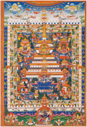 除佛像、佛塔外,唐卡收藏也是一大亮點(diǎn)。羅布林卡珍藏了大量18到20世紀(jì)勉唐畫派、欽則畫派和嘎赤畫派的各類作品。早期唐卡著名的有覺(jué)仲師徒像、帕木竹巴·多吉杰布像、印度尊者比瓦巴、那若巴像。其中覺(jué)仲師徒像唐卡,描寫的是印度尊者,噶當(dāng)派始祖阿底峽向貼身弟子仲敦巴(師徒合稱“覺(jué)仲”)傳授佛法的故事。畫面中心主尊阿底峽頭戴錐形遮耳帽,身披袈裟,雙手結(jié)說(shuō)法印,給身旁仲敦巴講法,仲敦巴著藏式袍服,結(jié)跏趺坐,側(cè)身聆聽大師教誨。畫面上、下分別繪有如來(lái)、藥師、觀音、度母諸佛及繪畫施主像,人物刻畫逼真、栩栩如生,背景以朱砂填色,輪廓用金線勾勒。這件13世紀(jì)繪制的“赤唐”作品,十分稀有,彌足珍貴。另外,在收藏諸多的嘎赤畫派作品中,以84位印度大成就者唐卡最具特色。這些唐卡的畫面,不同以往其他畫派作品,構(gòu)圖較為簡(jiǎn)潔,色彩淡雅。人物形態(tài)被描繪的極為夸張,塑造了一個(gè)個(gè)特殊而詼諧逗趣的大成就者形象。這種一反常態(tài)的畫風(fēng)作品,在外邊難得一見。還有以唐卡形式繪制的《四部醫(yī)典系列掛圖》,收藏也比較完整。系列掛圖,藏族稱為“曼唐”,它是以彩色連環(huán)畫形式系統(tǒng)描述了藏醫(yī)藥學(xué)的基本理論,人類解剖構(gòu)造,生理功能、疾病診斷治療方法,各種藥物種類以及人類如何養(yǎng)生保健、飲食搭配等內(nèi)容。“曼唐”制作完善于清代五世達(dá)賴?yán)锇⑼迳<未雸?zhí)政時(shí)期。最早成79幅,1916年十三世達(dá)賴?yán)锪钊擞衷鲅a(bǔ)了一幅“歷代西藏名醫(yī)圖”,形成80幅。這批系列掛圖,被視為標(biāo)準(zhǔn)藍(lán)本,完整保存在羅布林卡內(nèi)。