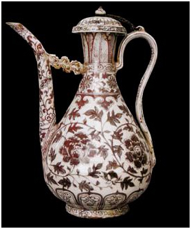 明洪武時(shí)期(公元1386年--1398年)贈(zèng)送的釉里紅牡丹紋執(zhí)壺,高37cm,足徑11cm,這是一件造型端莊美觀大方、繪工精細(xì)、十分鮮見的瓷器。由于釉里紅瓷器燒制難度大,成品率低,在現(xiàn)今中國(guó)內(nèi)地保存數(shù)量已很少,而在西藏能完好保存這件瓷品長(zhǎng)達(dá)600多年,實(shí)屬難得。